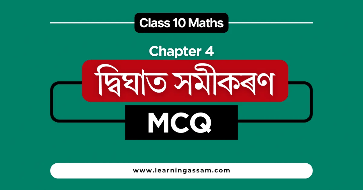 সকলো ছাত্ৰ-ছাত্ৰীক Learning Assam লৈ স্ৱাগতম। ইয়াত আমি আলোচনা কৰিম Class 10 Maths Chapter 4 MCQ Assamese Medium Question Answer (Class 10 দ্বিঘাত সমীকৰণ MCQ)। Class 10 Maths Chapter 4 MCQ in Assamese with Solution (দ্বিঘাত সমীকৰণ Class 10 MCQ) খনত সেইবোৰ প্ৰশ্ন অন্তৰ্ভুক্ত কৰা হৈছে যিবোৰ Class 10 Maths Chapter 4 MCQ Assamese Medium with Answer ৰ বাবে অতিকৈ গুৰুত্বপূৰ্ণ । SEBA Class 10 Mathematics Chapter 4 MCQ in Assamese প্ৰশ্ন উত্তৰ সমূহ অনুশীল কৰি ছাত্ৰ-ছাত্ৰী সকলে বহু পৰিমাণে লাভৱান হব। SEBA Class 10 General Maths Chapter 4 MCQ Assamese Medium ( Class 10 দ্বিঘাত সমীকৰণ MCQ) পঢ়ি ছাত্ৰ-ছাত্ৰীয়ে Class 10 Assamese Medium Maths Chapter 4 MCQ ত ভাল নম্বৰ পাব বুলি আশা ৰাখিলো।